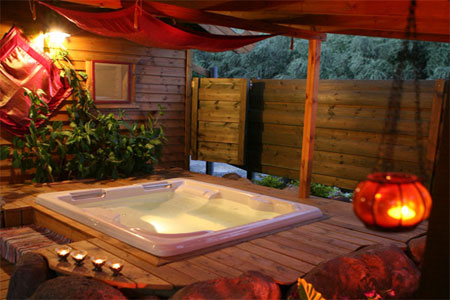 ג’קוזי עגול ומרווח מוקף חלוקי נחל וצמחיה ירוקה, ולצידו יין משובח, נרות וקטורת ריחנית.