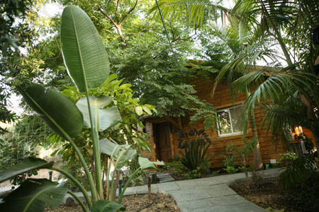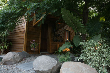 מחוץ לבקתות גינה ירוקה ומטופחת עם צמחי תבלין, צמחיה ירוקה פורחת, ערסלים ופינות ישיבה נוחות.